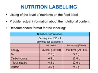 According to Garis Panduan Am Pelabelan Makanan Bahagian IV Peraturan-Peraturan Makanan 1985 the general requirements of food labelling in Malaysia are as follows. Food Labelling Guidelines 1 FOOD SAFETY AND QUALITY DIVISION MINISTRY OF HEALTH OF MALAYSIA GENERAL FOOD LABELLING GUIDELINES Part IV Food Regulations 1985 1. There are 4 types of nutrition claims that are permitted.